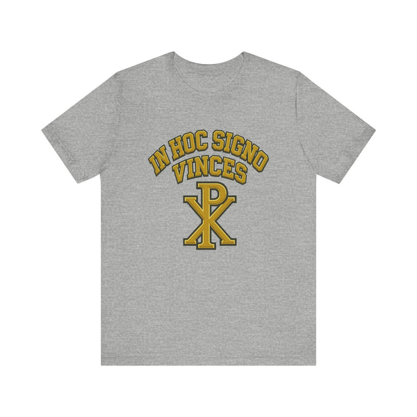 The shirt embodies 'In Hoc Signo Vinces,' a powerful symbol of spiritual victory, used by Constantine and rooted in Christian history.